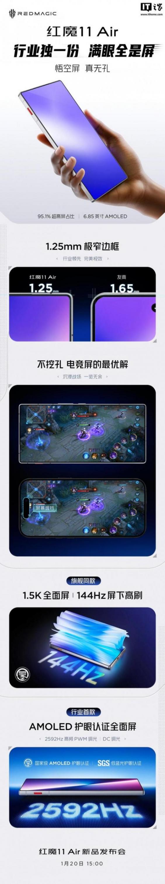 1 月 14 日消息,红魔 11 Air 手机今日官宣将搭载 6.85 英寸 AMOLED 悟空屏,宣称真无孔,拥有 95.1% 屏占比 + 1.25mm 极窄边框,支持 144Hz 高刷、2592Hz 高频 PWM 调光和 DC 调光,号称“电竞屏的最优解”。